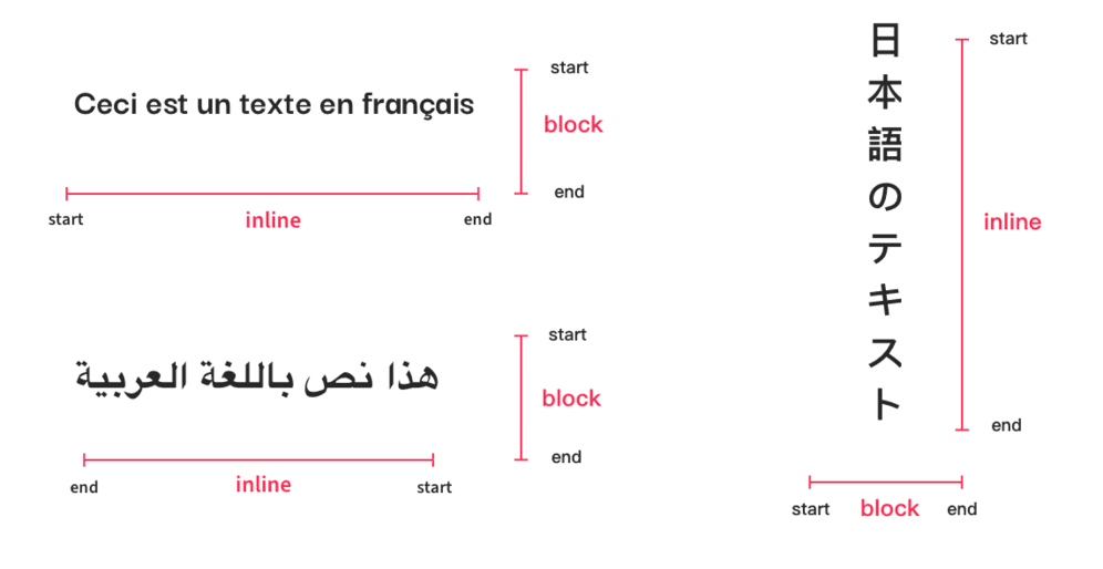 C’est aussi une langue qui se lit de gauche à droite et de haut en bas : start indique donc la gauche pour l’axe inline et le haut pour l’axe block.
