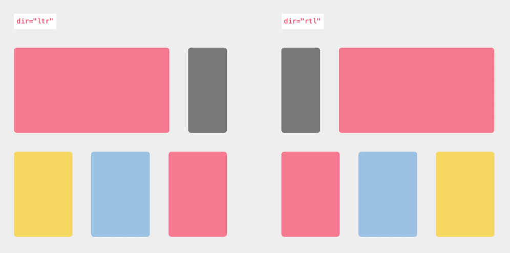 Avant même l’introduction des propriétés logiques certaines propriétés s’adaptaient déjà à la direction et au mode de lecture. C’est le cas des propriétés flexbox et grid. Voici un exemple de mise en page avec flex qui s’adapte en fonction de l’attribut dir :