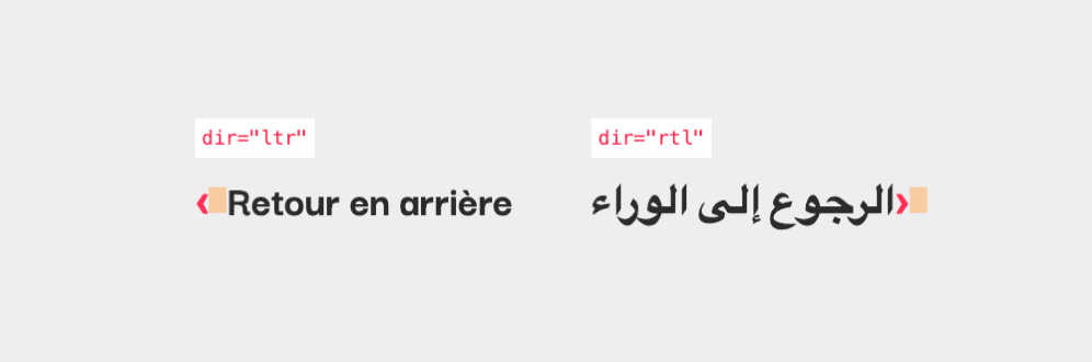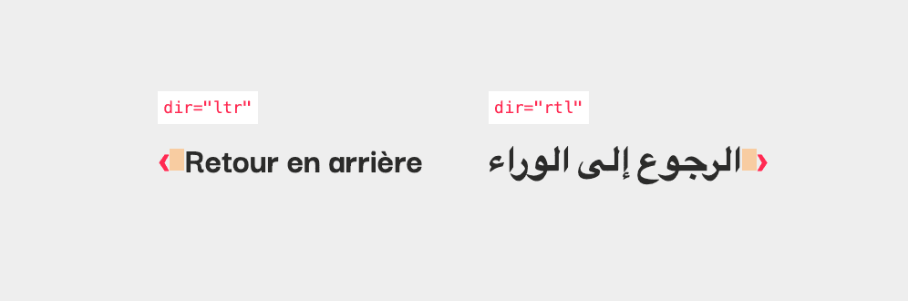 Admettons justement que nous ayons un lien de retour à intégrer sur un site. Pour ajouter un espace entre la flèche et le texte on applique une marge à droite sur cette première. Lorsque l’on modifie la direction de la page à rtl (right to left) le texte passe automatiquement aligné à droite et comme on a utilisé un caractère spécial pour la flèche, son orientation change automatiquement, super ! Cependant la marge reste à droite de la flèche alors qu’il faudrait désormais qu’elle soit à gauche de celle-ci.