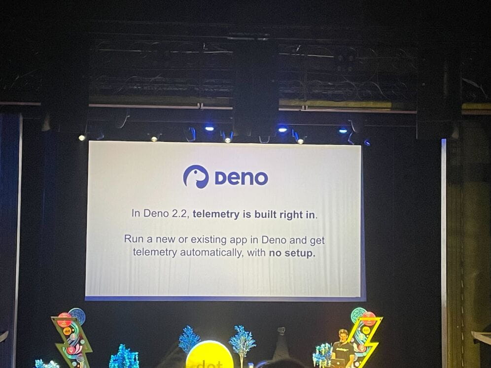 Avant la pause déjeuner Ryan Dahl, créateur de Node.js et cofondateur de Deno, est monté sur scène pour… une « annonce spéciale ». Au final, pas d’effet pyrotechnique mais un talk sur la dernière version de Deno et sa prise en charge d’open telemetry.