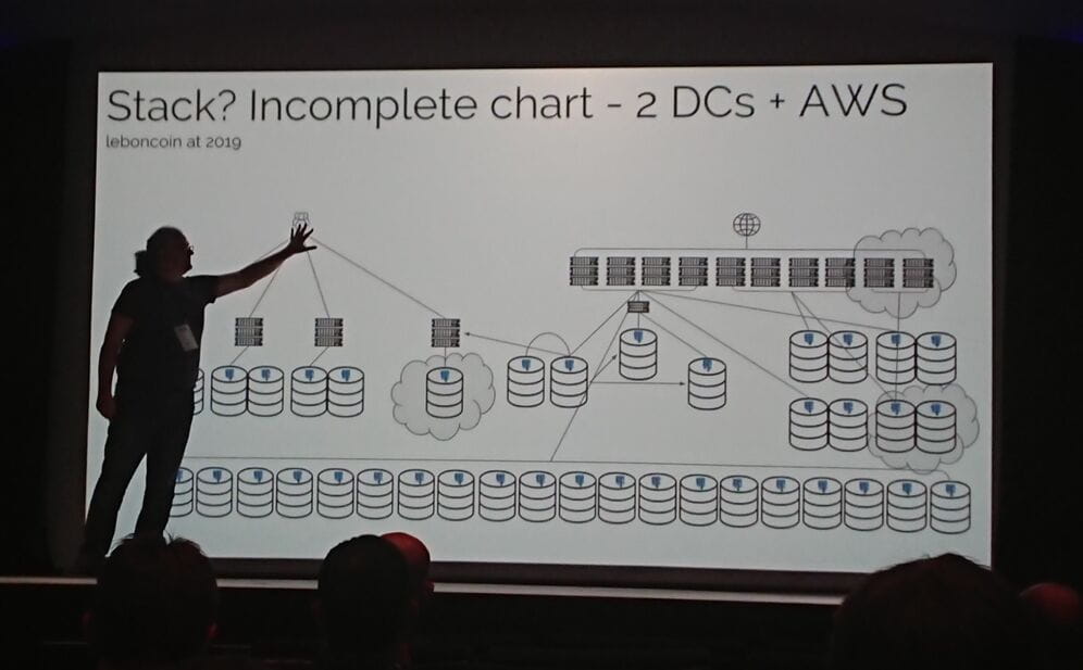 Flavio, seul DBA de Leboncoin, nous a montré l’impressionnante architecture de leur boîte (Le schéma complet ne tient pas sur la slide), quelques problèmes techniques et physiques qu’ils ont rencontré, et leurs solutions.